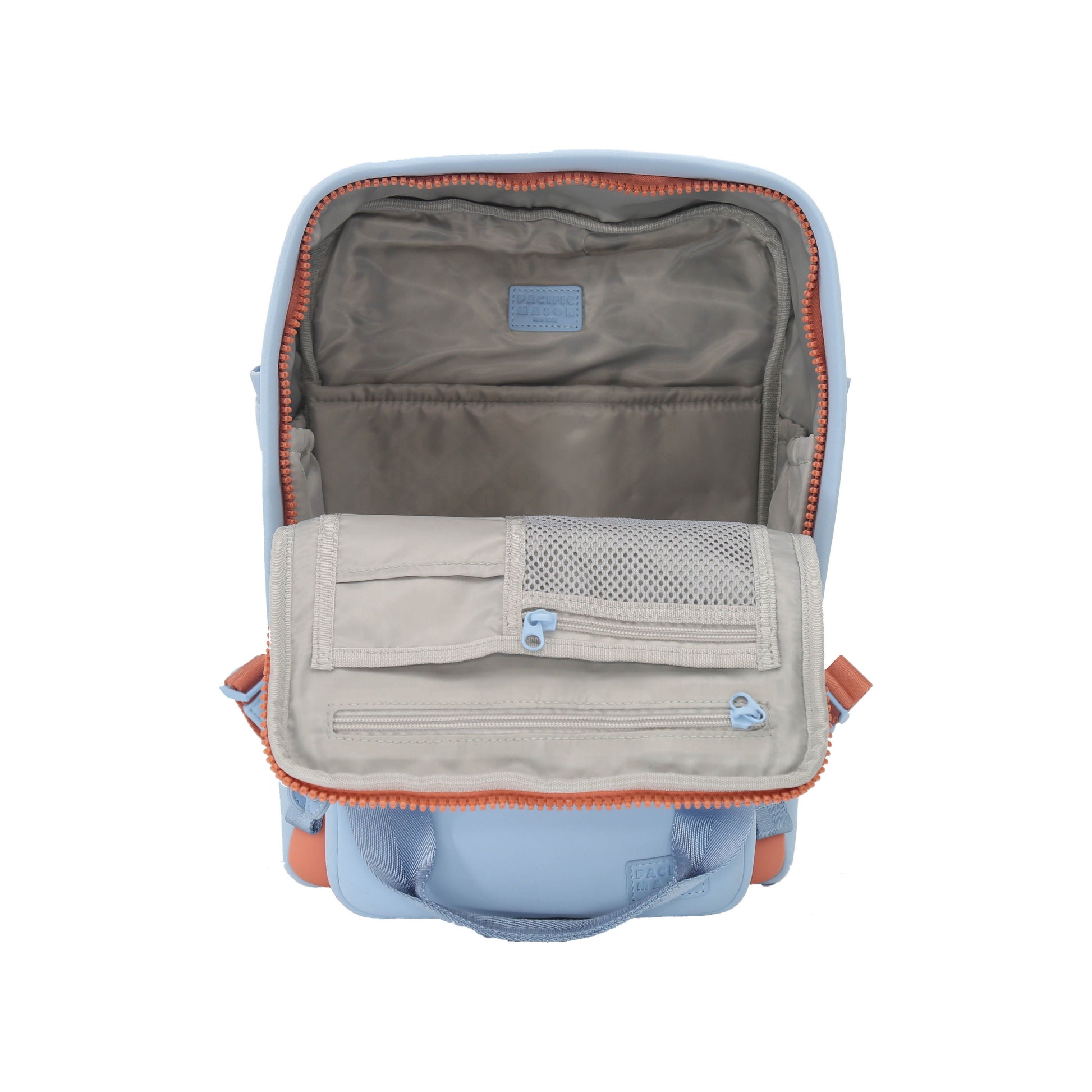 - Priekinė kišenė su užtrauktuku ( 8 colių (ilgis) x 7,5 colio (A) x 1,5 colio (W) ) su vidine kišene ir rašiklio angomis
