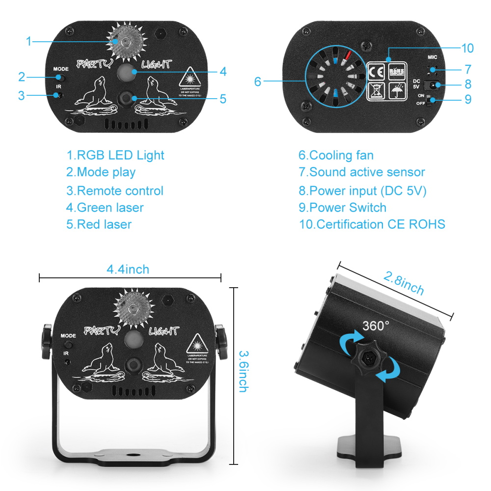* This mini laser light is made of aluminum material, which is super compact and powerful.This Stage Laser Light was Powered via the USB cable that came with the kit, USB port can be charged by computer, power bank or any device with USB port.